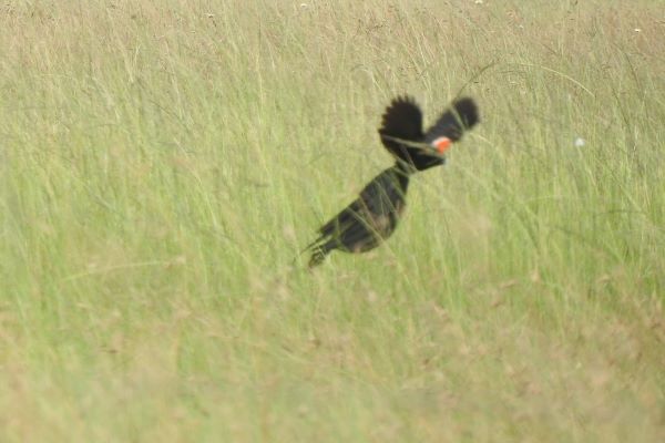 The Long-tailed Widowbird has a conspicuous and elaborate flight display over its grassland territory. The male slowly flaps his broad wings, with tail feathers held in an arc, while giving a swizzling call.