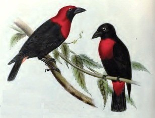 IntroductionThe Red-vented Malimbe was formally described by John Cassin, an American ornithologist and curator of the Academy of Natural Sciences of Philadelphia (ANSP), now Academy of Natural Sciences of Drexel University. Cassin incorrectly typed Scobius scutatus for the type description, even though he listed the genus header Sycobius correctly and in all future publications he also listed Sycobius scutatus correctly.The Red-vented Malimbe was collected by Dr Robert MacDowell, a surgeon attached to the colonial government of Sierra Leone. The type locality is given as Western Africa but has been inferred to be Sierra Leonne, where MacDowell was based. MacDowell collected several types of bird species, with type localities listed as either West Africa, or as “St. Paul’s River, western Africa”, eg the White-crested Hornbill was collected at St. Paul’s River. Bates (1937) suggested that the Red-vented Malimbe was also collected at St. Paul’s River, which is in Liberia. This suggestion by Bates has been overlooked by other authors. MacDowell’s specimens were obtained by ANSP. Cassin published more on the birds of Africa than on birds from other continents, because of the large collections received from West Africa and other parts of Africa, especially from Du Chaillu and MacDowell (or McDowell) (Stone 1899). The first illustration of a Red-vented Malimbe is a colour painting published by Cassin 1850. The second illustration was published by George Shelley when he described what he thought was a new malimbe (Malimbus rubropersonatus, but later he realised that it was an immature Red-vented Malimbe – the illustration appears under the Biology section. The third illustration for the species was the first time that the well woven nest was illustrated (Buttikofer 1890). Scientific citationS[y]cobius scutatus Cassin 1849 Prov. Acad. Nat. Sci. Philadelphia, 4, p.157, Western Africa (inferred to be Sierra Leonne). Meaning of namesscutatus – Latin: scutatus, armed with a shield (scutum, a shield) – this refers to the red breast of the bird. First English nameThe shield Malimbus (Reichenbach 1863) – see Latin name above. Alternate namesCameroon Red-rumped Malimbe, Red-rumped Malimbe, Red-vented Weaver, The shield Malimbus. CollectorDr Robert MacDowell. Date collectedBefore 1849, but date unknown. Locality collectedWestern Africa, probably near St. Paul’s River in Liberia. Type specimensMacDowell collected 2 pairs: ANSP 14104 (holotype), ANSP 14106, ANSP 14105, ANSP 14107 and these are housed in the Academy of Natural Sciences of Drexel University. |