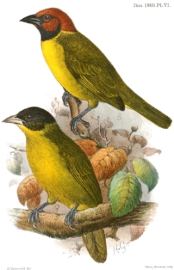 IntroductionBates’s Weaver was formally described by Richard Bowdler Sharpe, an English zoologist and ornithologist who worked as curator of the bird collection at the British Museum of natural history.Bates’s Weaver was collected by George Latimer Bates, an American naturalist. Bates visited West Africa in 1895, making a living by farming. In 1905 he settled on the Ja River, Cameroon, calling his farm Bitye (after the Bulu pronunciation of his name). He collected many natural history specimens, especially birds, in his travels and sent many of these to the Natural History Museum in London. Bates obtained the type specimen of Bates’s Weaver, a female in subadult plumage near the Dja River on 29 January 1906, presumably near Bitye farm (as stated by Bannerman 1949a). On 17 Nov 1908 a second specimen, the first adult male, was collected at nearby Kumangola. In the following year four more birds were collected at Bitye and sent to the British Museum. Bates did not observe these rare weavers alive; they were all collected by local boys with bows and arrows (Bates 1930a). Bates obtained the first Bates’s Weaver specimen in January 1906, nearly a month before obtaining the Red-crowned Malimbe type, but Sharpe described the latter first. Bates’s Weaver was first illustrated by Ogilvie-Grant (1910), showing the female type and first male specimen. The next illustration to be published was a line drawing in Bannerman (1949), showing the male and female. Scientific citationOthyphantes batesi Sharpe 1908a, Ibis p.348, Dja River, Cameroon. Meaning of namesbatesi, Named after George Latimer Bates (1863-1940), a naturalist in tropical West Africa, 1895-1931. First English nameBates’s Weaver-Finch (Sharpe 1910a). Alternate namesBates’s Weaver-Finch. CollectorGeorge Latimer Bates. Date collected29 January 1906. Locality collectedRiver Ja, Cameroon. Type specimensThe type is in the British Museum (BM 1908.5.25.104). |