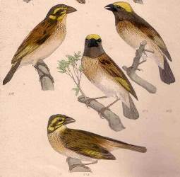 The first illustration of a Streaked Weaver is a line drawing of the head and bill in Swainson 1838. The next illustration is a set of birds painted in colour by Reichenbach (1863).