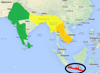 P. m. manyar occurs on Java, Bawean and Bali Islands (see red on map).