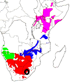 ![]() Identification. The White-browed Sparrow-Weaver is a large brown and white weaver that is fairly common. It has a conspicuous broad white stripe from above the eye backwards, and 2 prominent white wing-bars and wing edgings. In flight, a large white patch on the rump and uppertail-coverts is visible. ![]() Distribution. The White-browed Sparrow-Weaver the most widespread of the sparrow-weavers, occurring in southern and eastern Africa. It has four subspecies: The White-browed Sparrow-Weaver appears to have increased its range and abundance in many areas (read more here and Kruger). For example, in the Eastern Cape it was first seen on Rookwood farm in the 1980s, and since 2000 has several colonies (see sparrow-weaver colonies on Rookwood here). This species has probably increased in number of nests at Barberspan (see here). The species seems to be increasing in Kenya, e.g. it was described as a new-comer to Ngulia in the past 2 years (VM 1977) and is increasing in Nairobi. Habitat. The White-browed Sparrow-Weaver inhabits mopane and acacia savanna, with <600 mm annual rainfall. It is also found in riverine fringes and gardens. Food. The White-browed Sparrow-Weaver feeds on insects and seeds. Insects include termites, weevils, tenebrionid beetles, ants, caterpillars and small moths. Seeds of grasses and cereals are important in winter. It takes bread and other scraps at camp sites. Breeding. The White-browed Sparrow-Weaver is a colonial, cooperative breeder, living in groups of 2-11 birds. There is a single breeding female in each group, that is replaced by another group member in time. There is a dominant, breeding male that is eventually replaced from outside the group. Helpers related to the breeding pair help defend the territory and feed the young; unrelated helpers only help in group defence of the territory. The average colony size is 16 nests, but may be up to 20 nests in a single tree. The nest is an elongated retort ball, with a domed roof. It is built only from dry grasses 15-60cm long. One occupied nest contained 983 pieces of grass. About 60% of roosting nests are converted to breeding nests by closing one of the 2 entrances, and then lining with feathers. The nest is placed in trees, 2-8 m above the ground. Mopane and Acacia trees are often favoured. Most nests are placed on the side of the tree away from the prevailing wind. Nest construction takes 10-18 days; and is by both members of the pair and helpers may contribute. Nest-building activity is throughout the year. Its nest sometimes has a longer entrance, as shown right. Birds like the Ashy Tit Parus griseus, Black-checked Waxbill Estrilda erythronotos and Red-headed Finch Amadina erythrocephala may use their nests for roosting. |